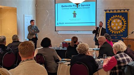 Detective Sergeant Martin Charbonneau and Detective Constable Devan Aris were pleased to share up-to-date information and awareness to the Rotary Club of Belleville on latest fraud trends and scams and how best to avoid becoming a victim of fraud. Both are members of the Belleville Police Service, assigned to the Criminal Investigation Division, responsible for major crimes from homicides to complex frauds.